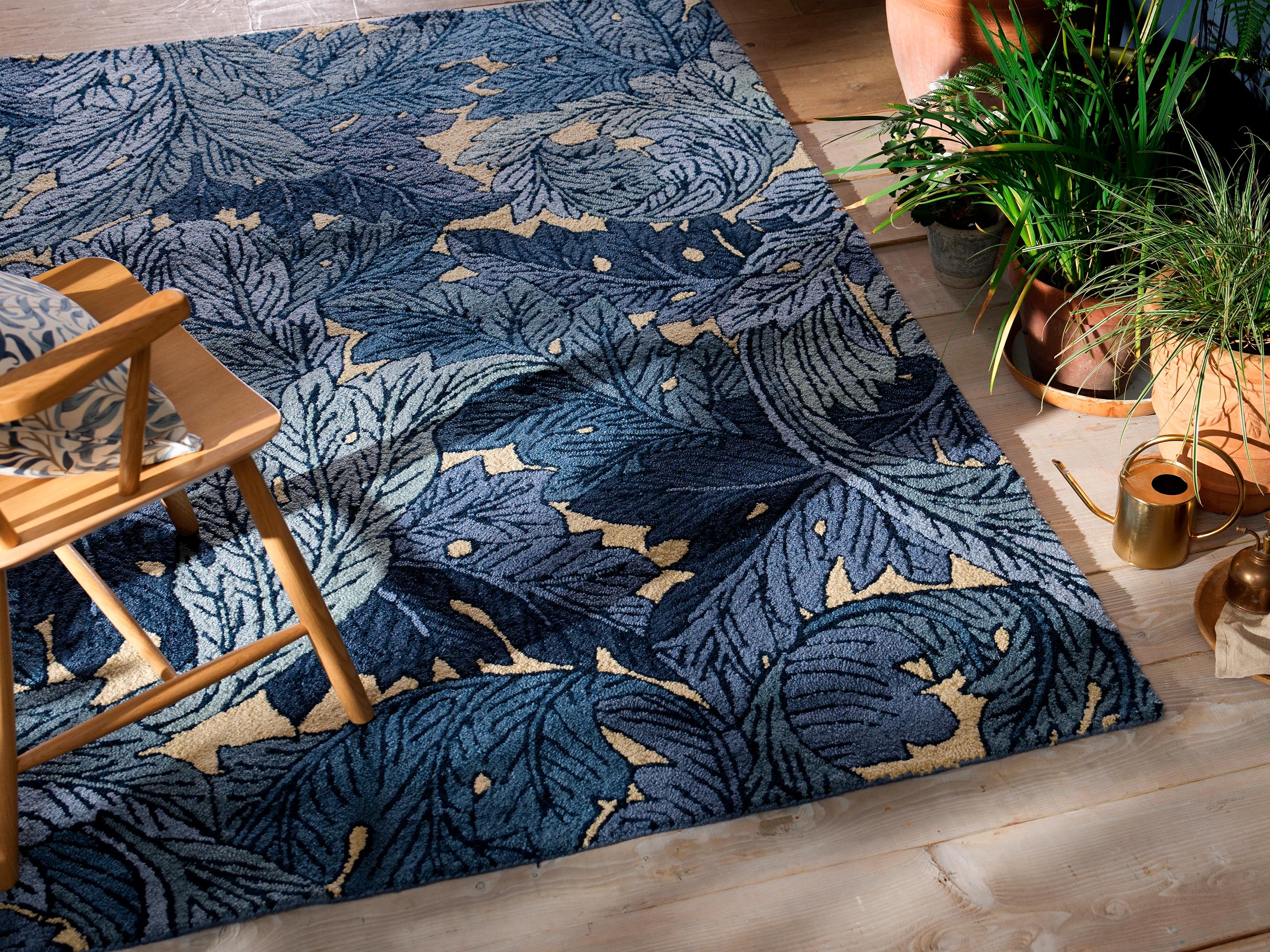 De Morris & Co Acanthus Indigo tapijt is een prachtige belichaming van kunstzinnigheid en verfijning. Gemaakt in India, heeft dit exquisite stuk een betoverend bloemontwerp dat moeiteloos de esthetiek van elke ruimte verbetert, of het nu uw eetkamer, woonkamer of slaapkamer is.